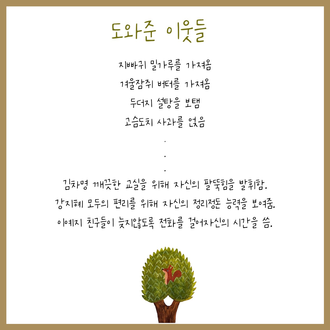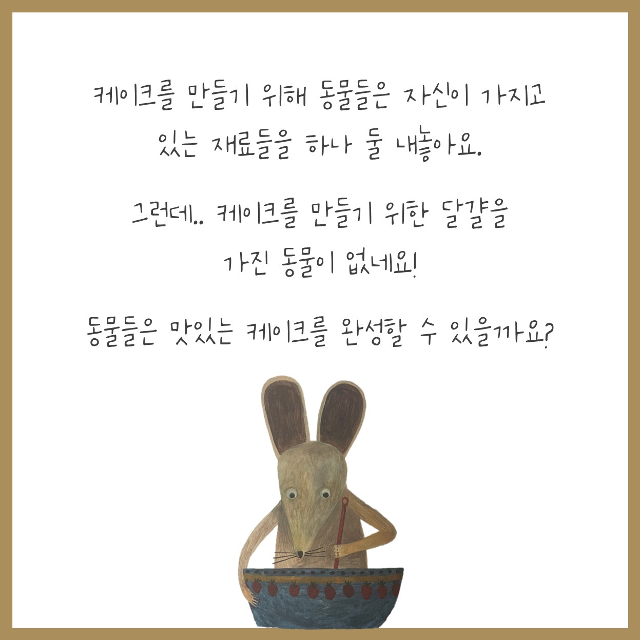 맛있는 케이크를 만들기 위해 재료를 찾아다니는 동물들의 이야기를 읽으며 행복한 우리반을 위한 나의 역할을 고민해봐요 🤗