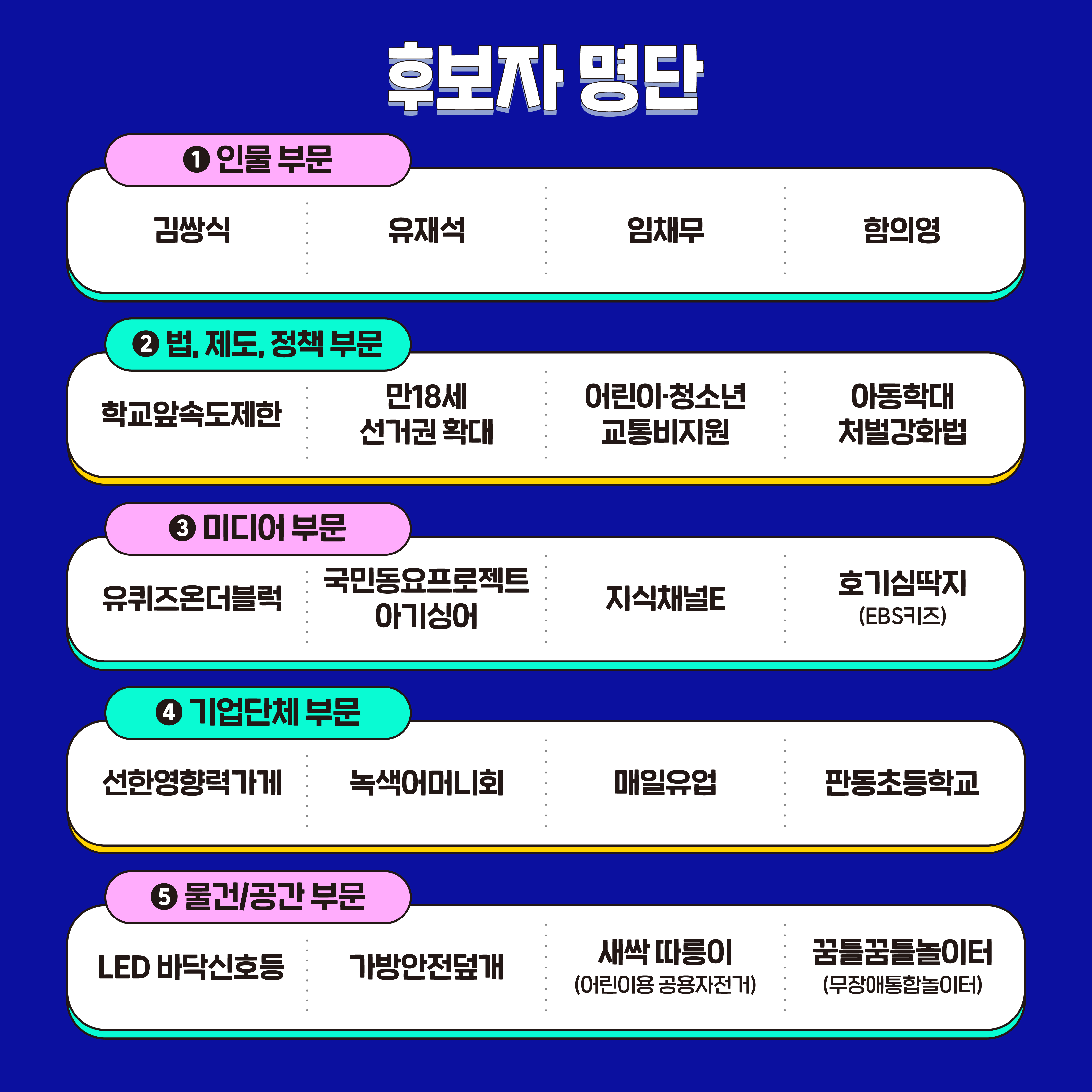 인물부분 / 법, 제도, 정책 부문 / 미디어 부문 / 기업단체 부문 / 물건, 공간 부문 5개 부문을 대상으로 아동들이 투표를 해요.