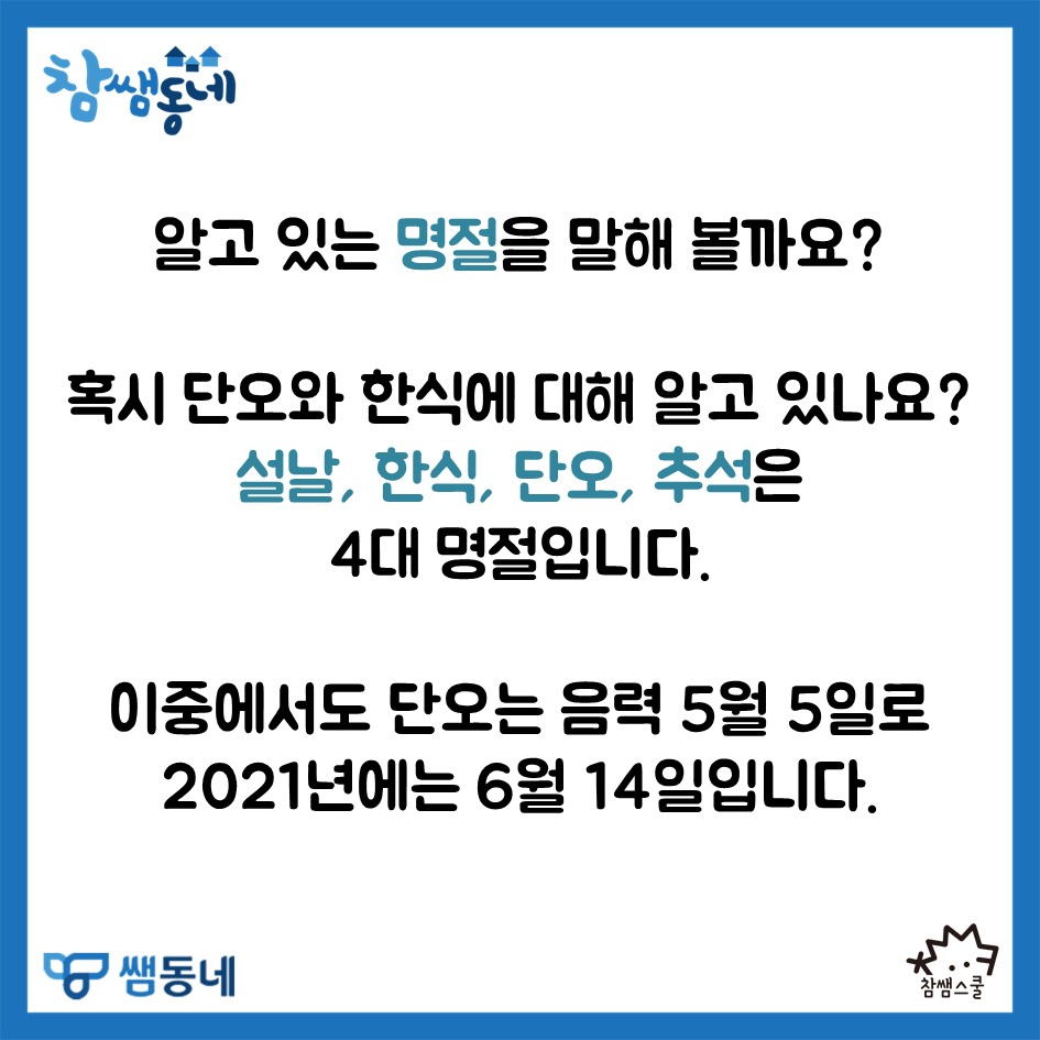 제목 옆 첨부파일을 확인하시면 다운로드 가능합니다! 댓글과 좋아요는 사랑입니다 우리나라의 4대 명절에 대해 알고 있나요? 우리나라 4대 명절은 설날, 한식, 단오, 추석이에요! 곧 다가오는 6