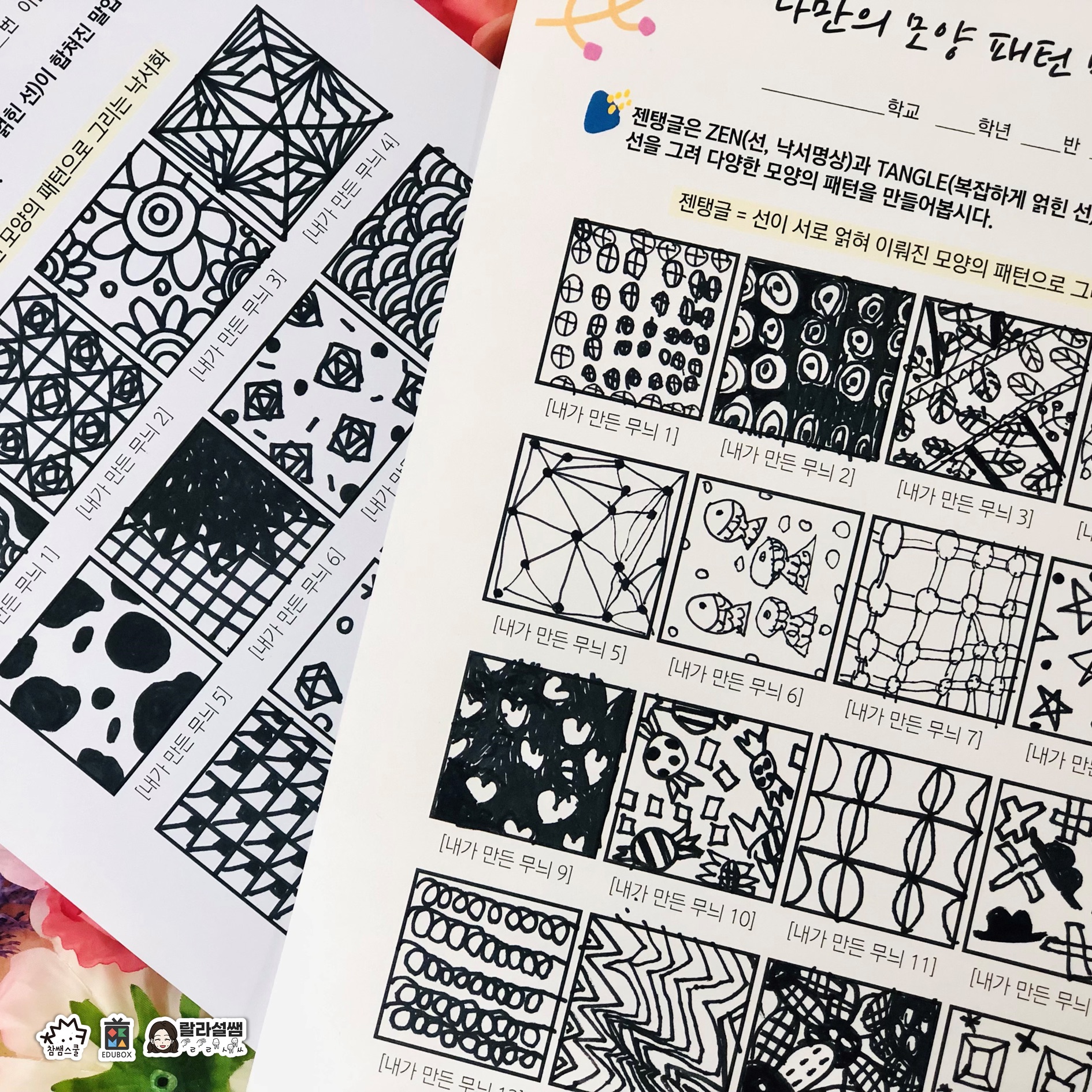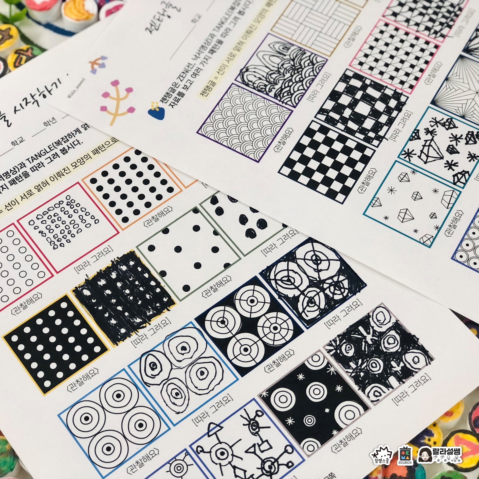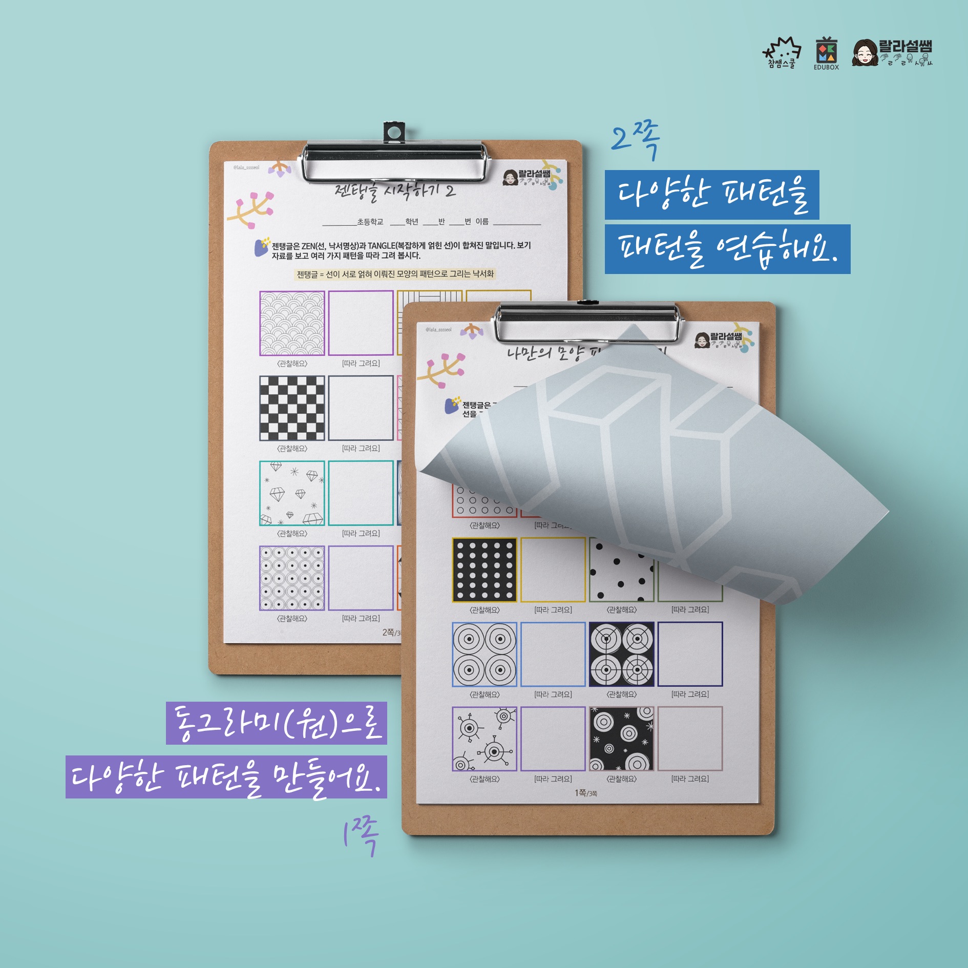 주어진 패턴을 따라 그려보았다면, 다음은 스스로 패턴을 만들어 볼 수 있도록 ‘나만의 모양 패턴 만들기(3쪽)’ 활동지로 다양한 젠탱글을 만들어 보세요.