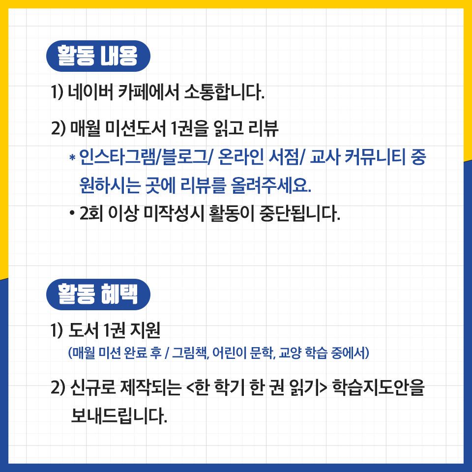 ③작성하신 서평은 개인 SNS(블로그, 인스타그램), 온라인 서점, 교사 커뮤니티 중 원하시는 곳에 올려 주신 후 해당 게시물 URL을 카페에 공유해 주시면 됩니다.