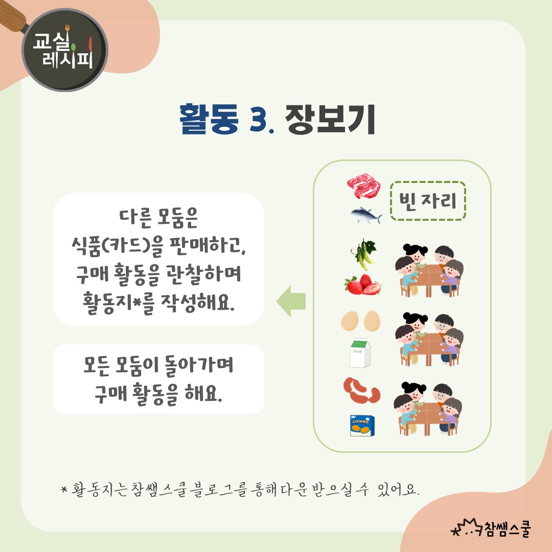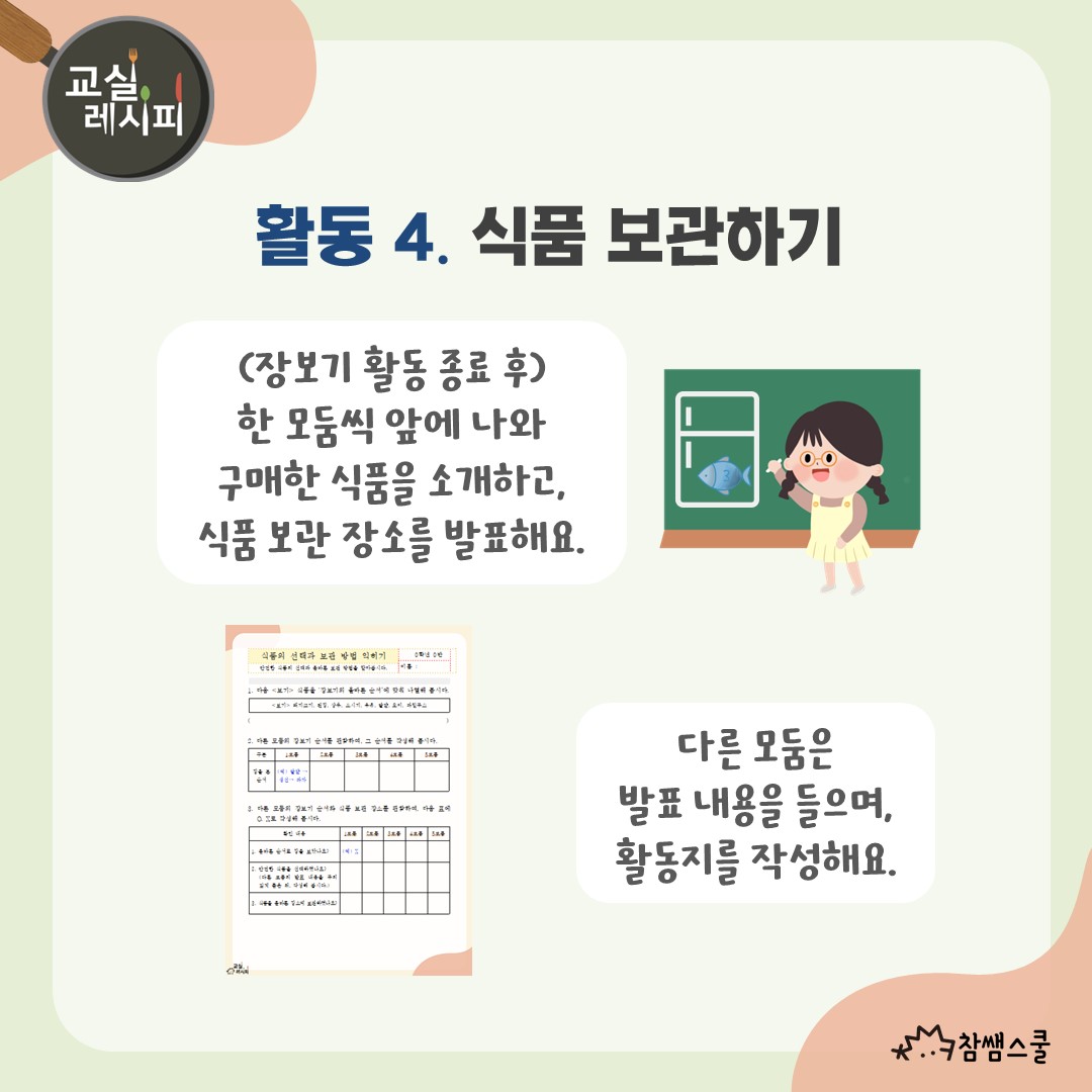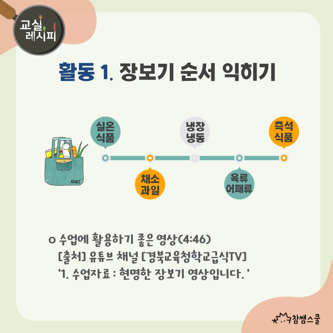 모둠 활동을 통하여 안전한 장보기 순서부터 식품의 올바른 보관 방법을 익혀보는 건 어떨까요?