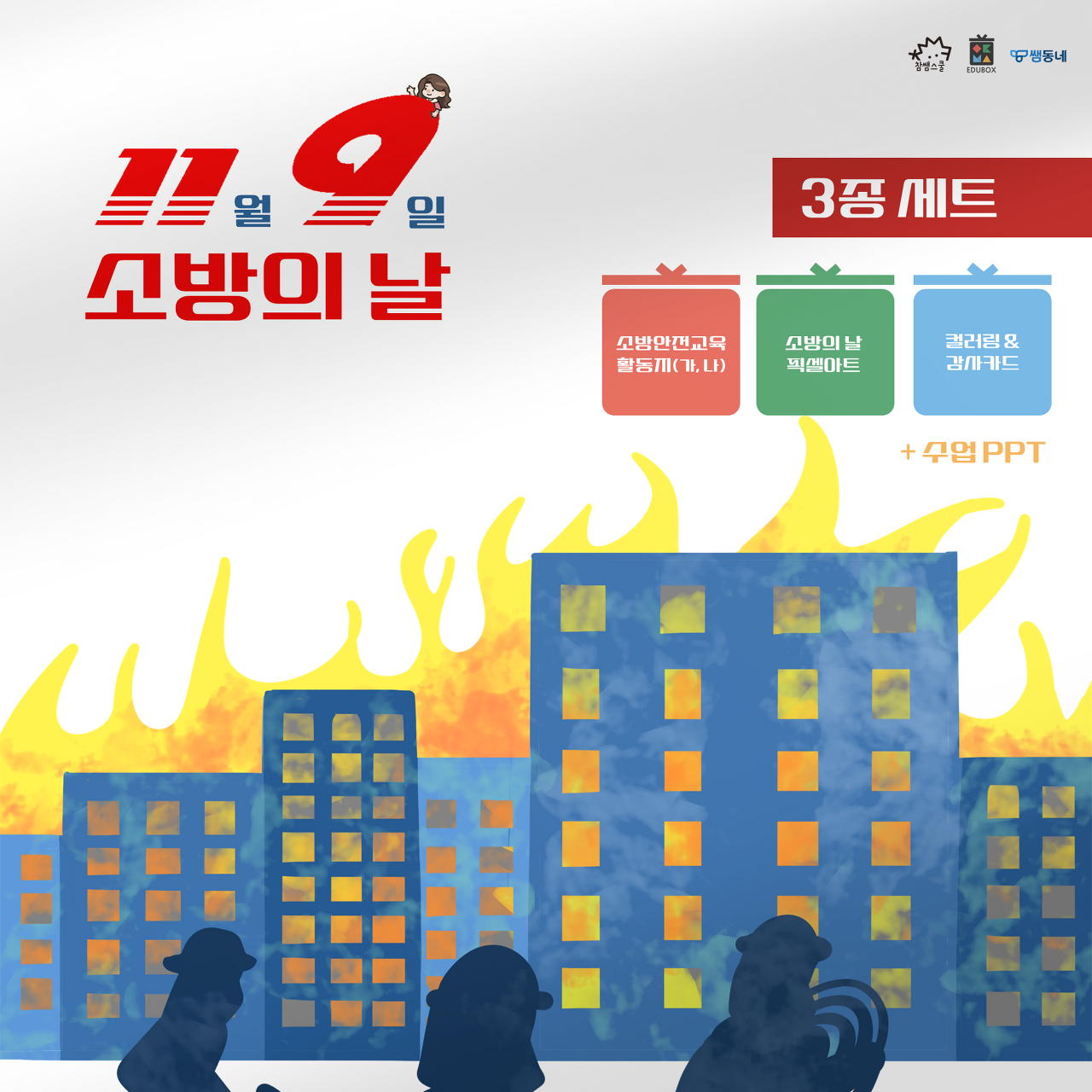 119, 11월 9일 11월 9일은 소방의 날입니다. 소방의 날을 맞아 활동지 3종과 관련 수업 PPT를 준비했어요. 수업 관련 PPT 하나, 현직 소방관이 알려주는 소방안전교육 영상 시청 후, 소방안전교