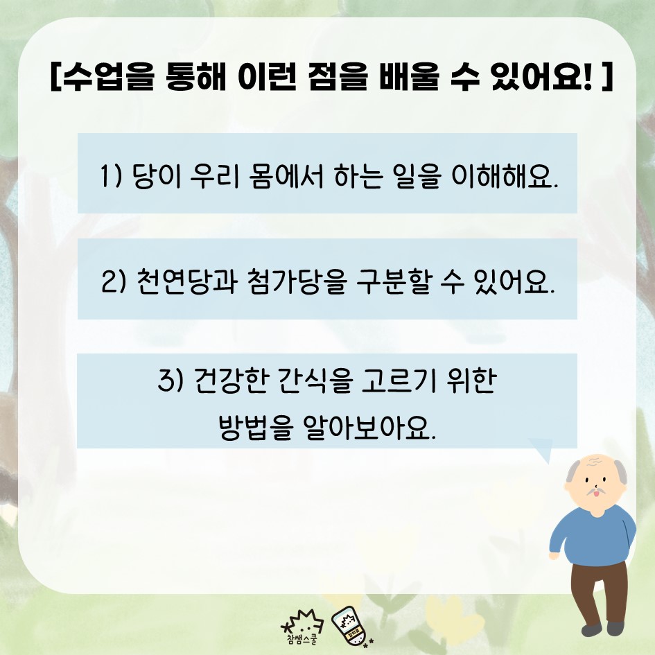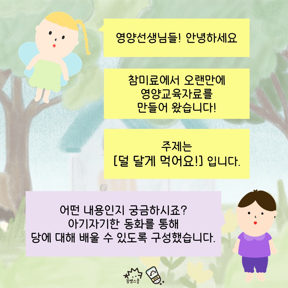 수업을 통해서도 저당에 대해 이야기 나눠 보면 좋을 것 같아 준비한 이번 주제는 <덜 달게 먹어요>입니다.