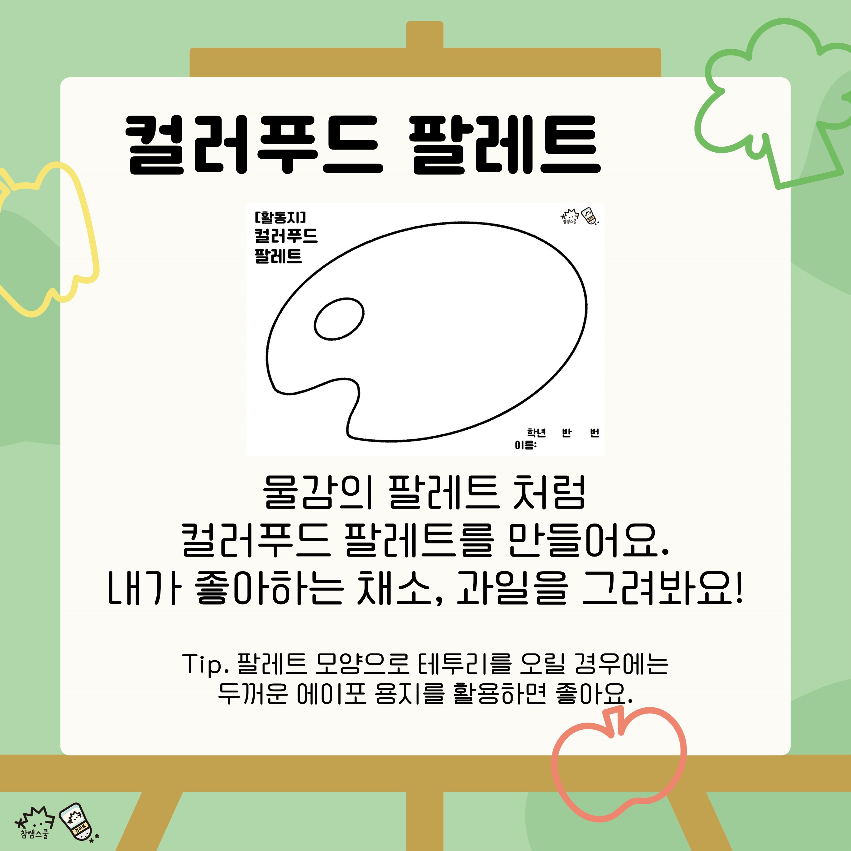 학년과 차시에 따라 컬러푸드 사전을 만들거나 컬러푸드 팔레트를 만들며 수업을 마무리해요.