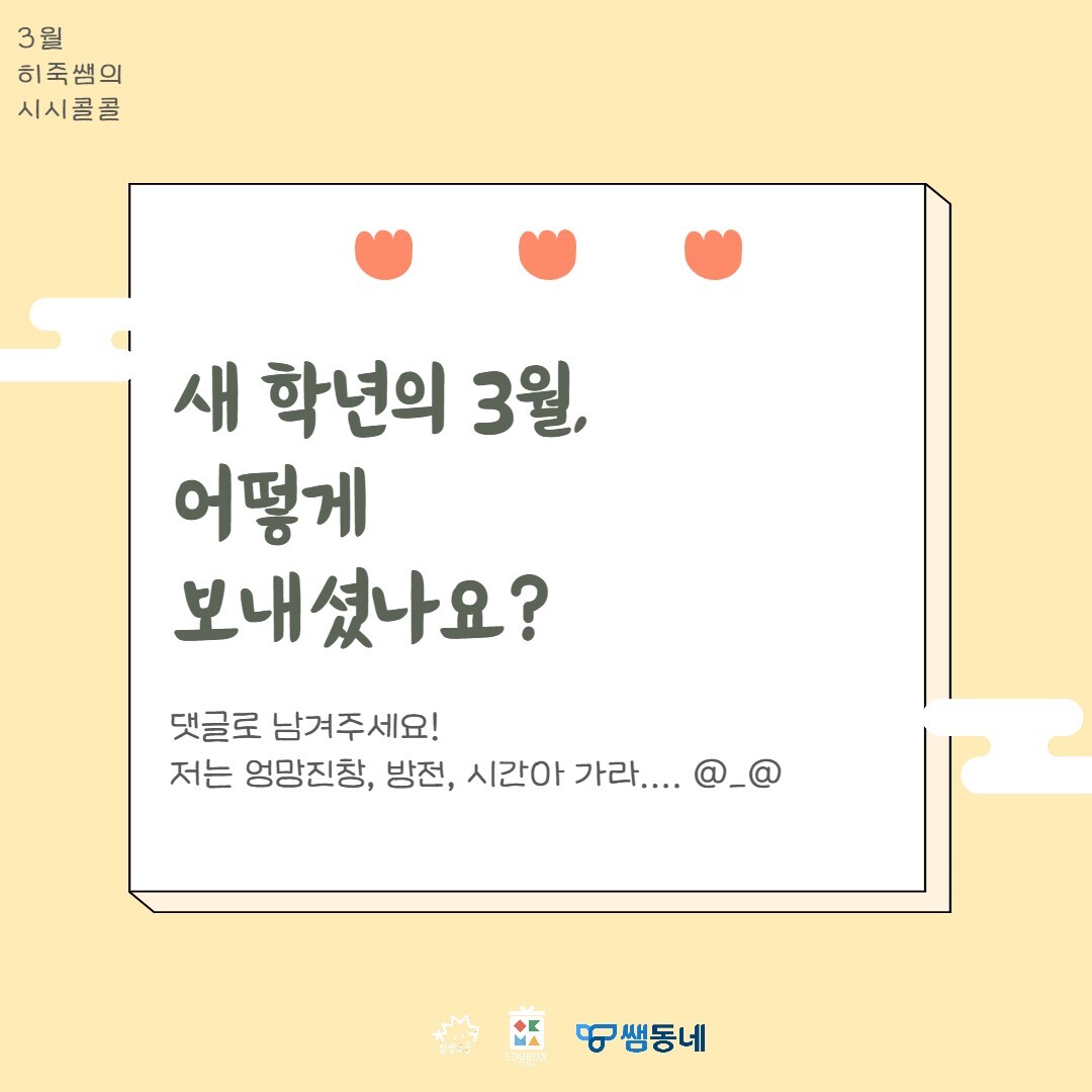 3월이 끝나가고 있습니다 (소리 질러엇!) 선생님의 3월은 어떠셨나요? 새로운 반, 새로운 아이들, 어쩌면 새로운 학교! 3월은 왜 매번 겪어도 새로운 지 모르겠어요.😥 아마 우리 아이들도 그러겠