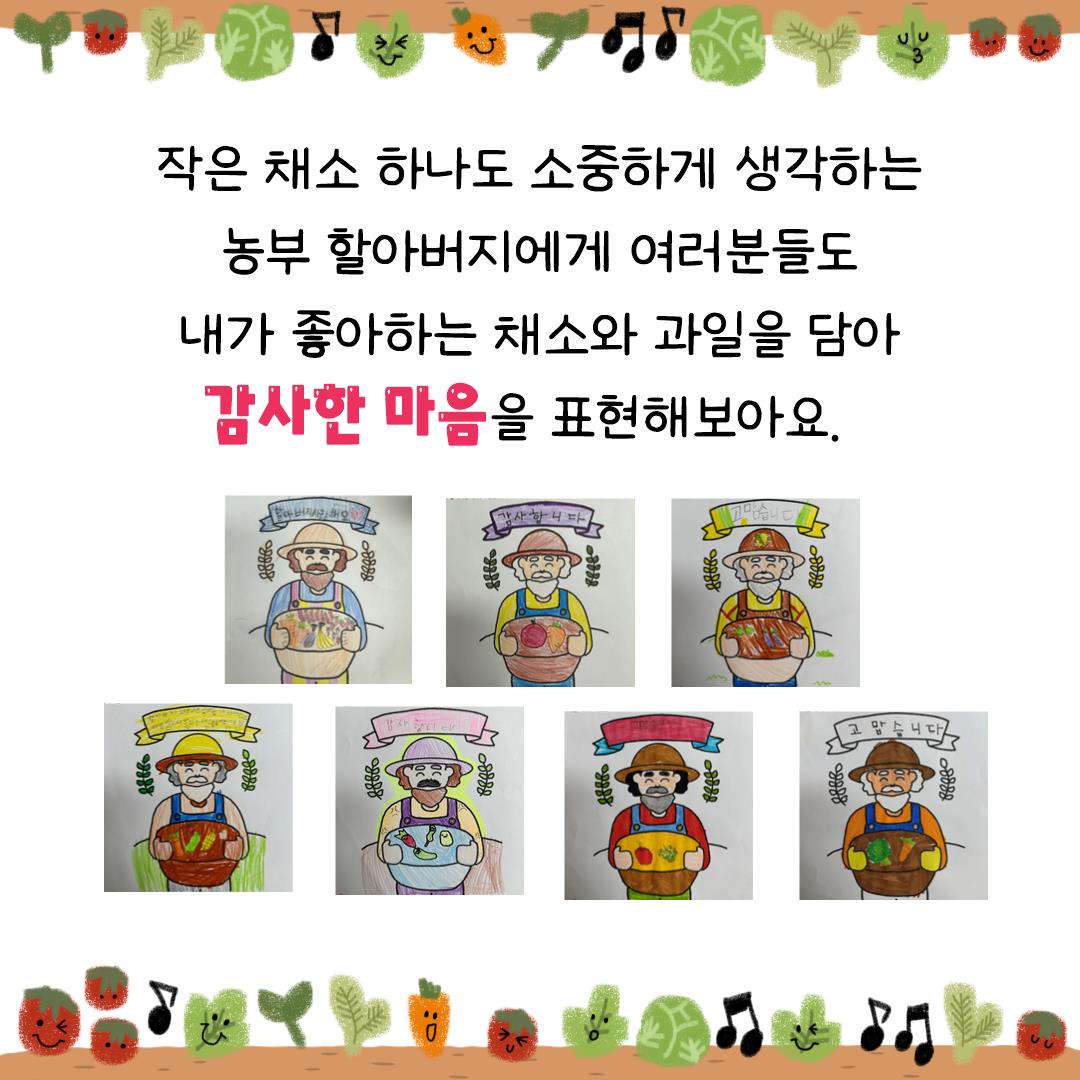 ✏️활동지를 통해 농부 할아버지에게 감사함을 표현해보아요. 그리고 먹기 싫은 채소도 한 입씩은 먹어보는 마음을 가진다면 좋을 것 같아요.