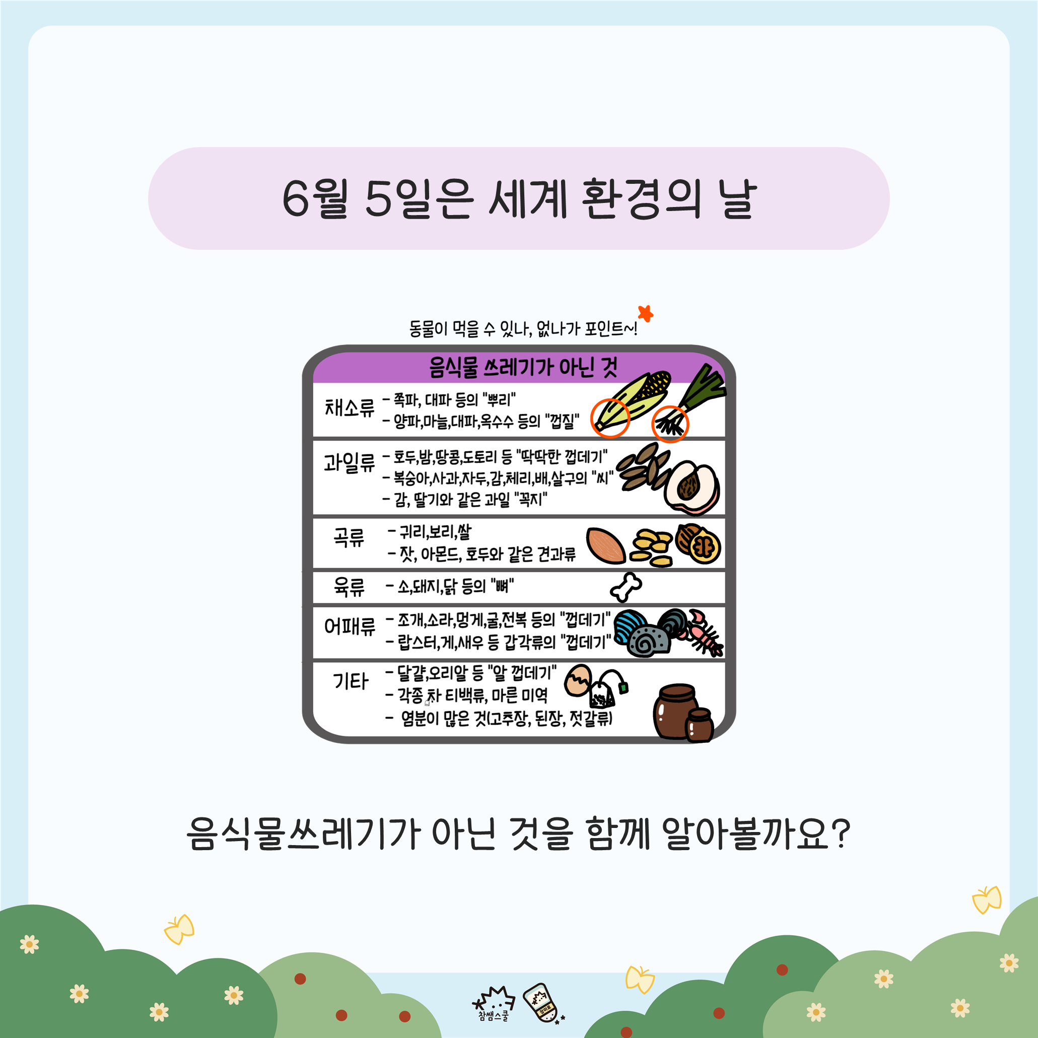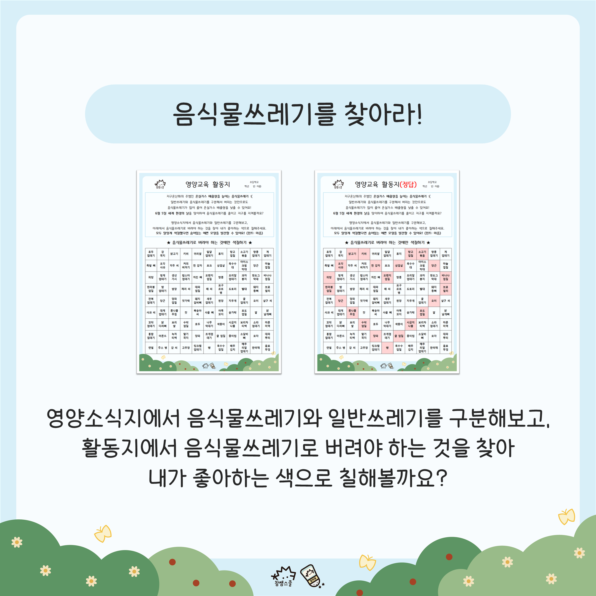 🌍6월에 '세계 환경의 날'이 있다는 걸 알고 계셨나요? 이를 맞이하여 음식물쓰레기와 일반쓰레기 구분법을 알아보고 음식물쓰레기로 버려야 하는 것을 찾아 활동지에 색칠하여 통해 알아봅시다.