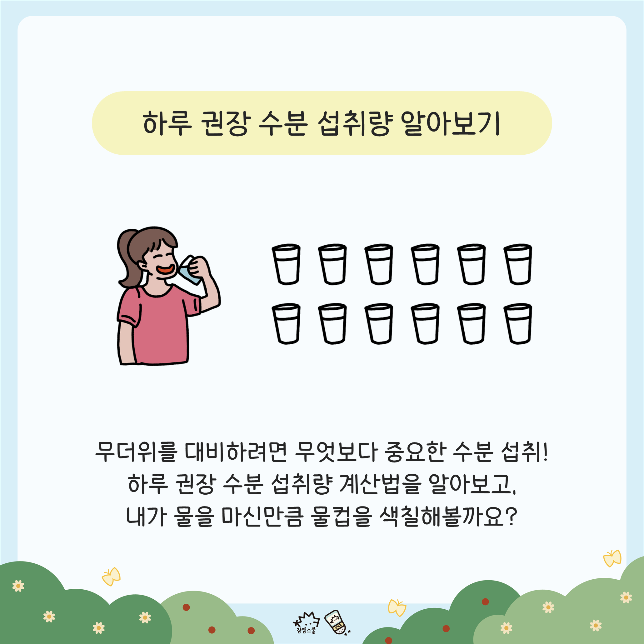💧무더위를 대비하려면 무엇보다 중요한 수분 섭취!! 나는 하루에 얼만큼의 물을 마셔야 적당한지 계산해보고 마신 물만큼 컵을 색칠해 보아요.😚
