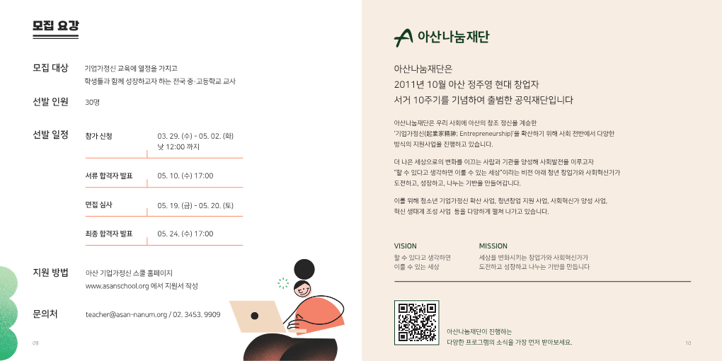 그 중 기업가정신팀에서는 다양한 사업 중 기업가정신 전문 교육자 양성 과정 '아산 티처프러너(Asan Teacher-Preneur)'를 운영하고 있는데,