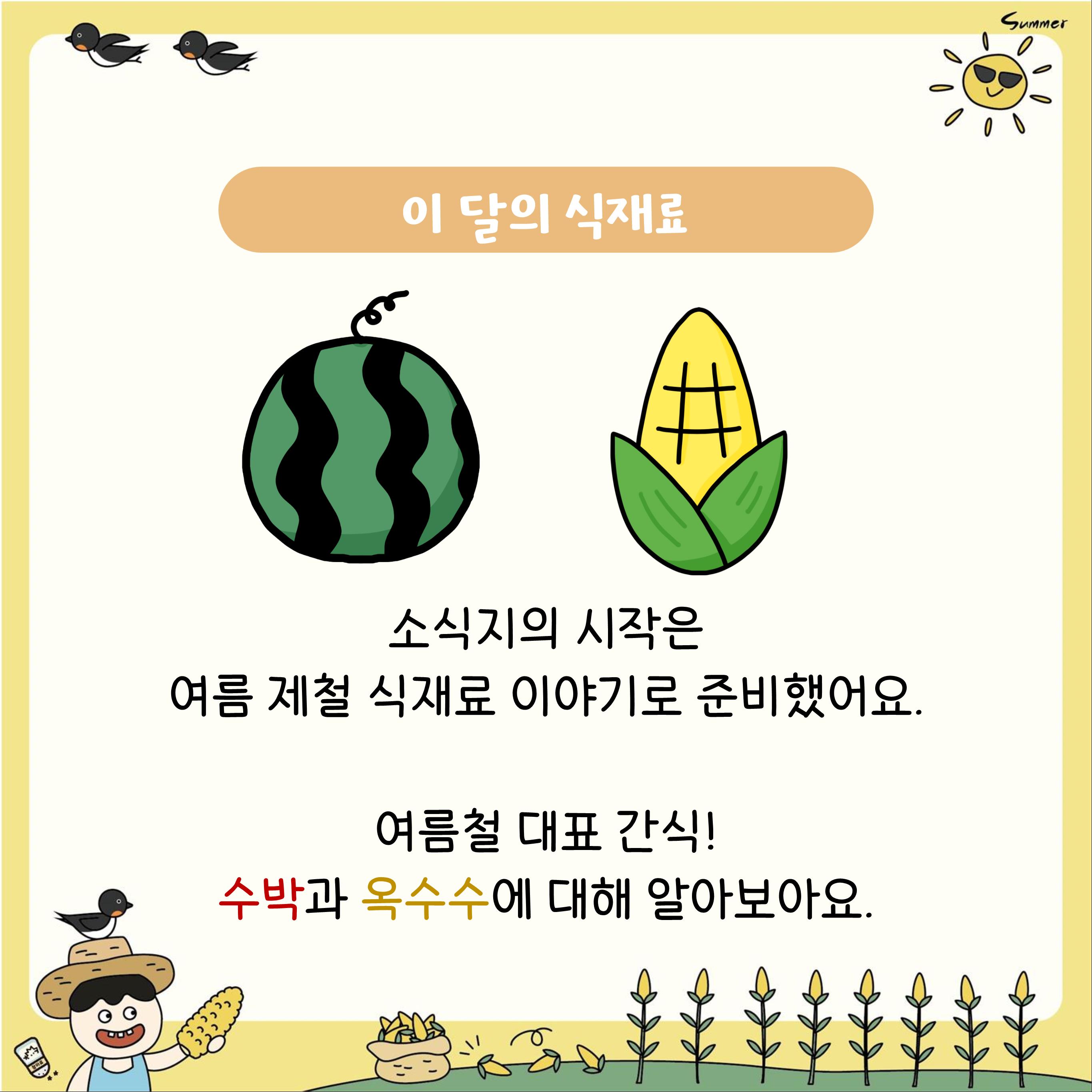 🌽여름철 제철 식재료! 무더운 여름에 간식으로 즐겨 먹는 수박과 옥수수에 대한 정보를 담았어요.