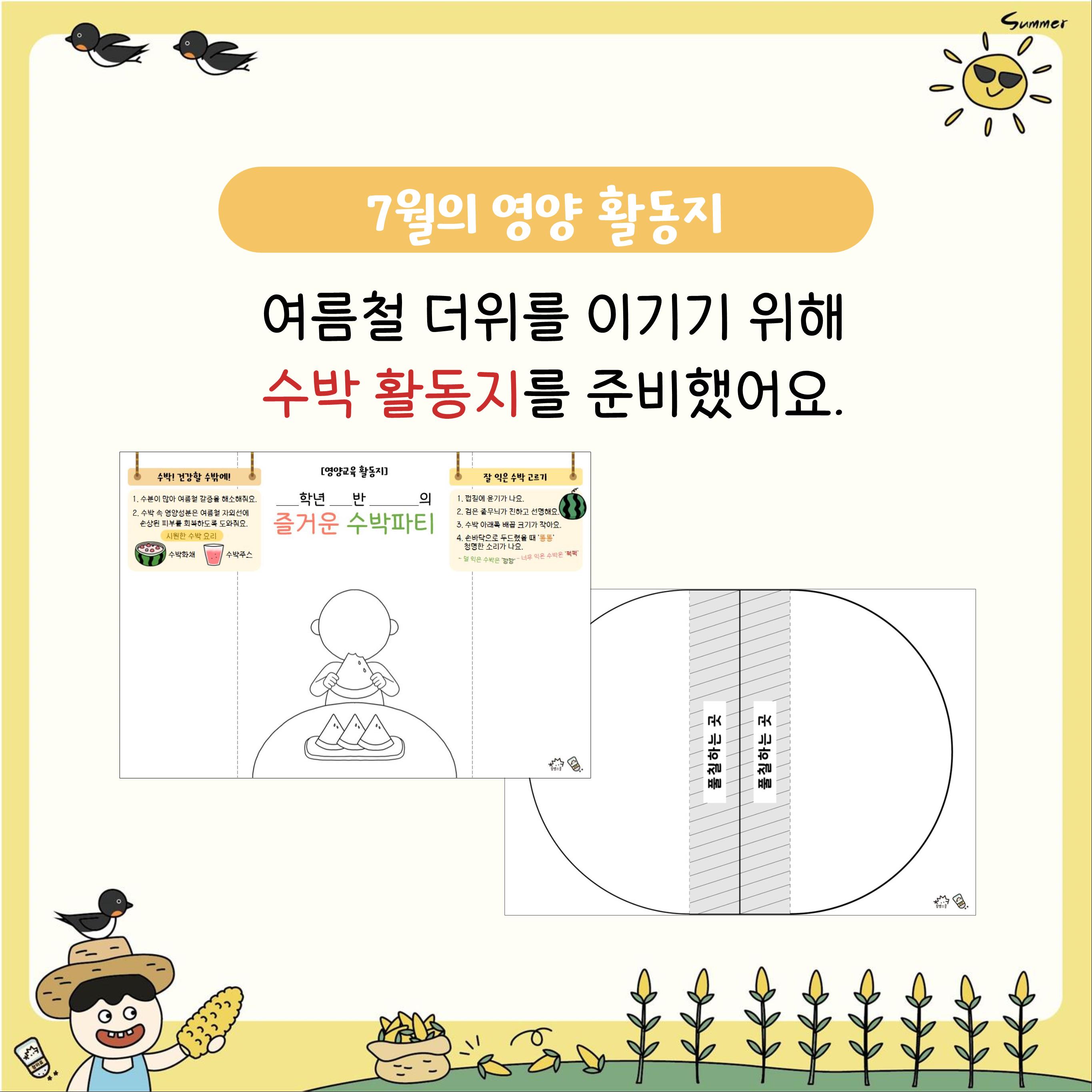 ☀️이번 영양교육 활동지는 무더위를 시원하게 날려줄 수박파티 초대장 만들기를 준비했어요. 초대장 안에는 수박의 영양정보와 함께 잘 익은 수박을 고르는 방법을 담았어요. 수박파티를 함께하고 싶은 친구들을 그리고 예쁘게 색칠해서 수박파티 초대장을 완성해요!💚