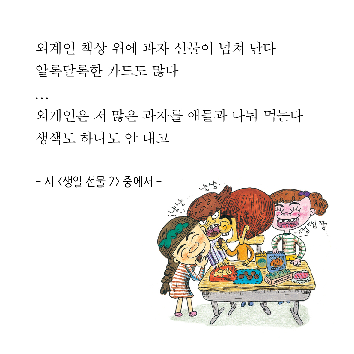 하나의 이야기 안에 아이들의 다양한 감정과 사건을 동시로 풀어 놓고 있습니다.