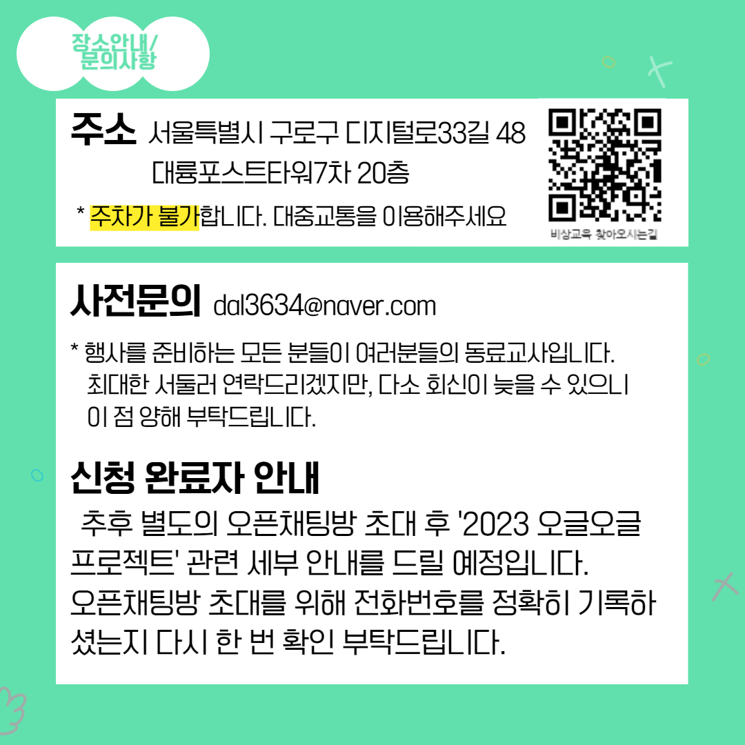 참가 신청 후 아래 계좌로 입금된 분들에 한해서 참가 신청이 완료되며, 추후 별도의 오픈채팅방 초대 후 '2023 오글오글 프로젝트' 관련 세부 안내를 드릴 예정입니다.