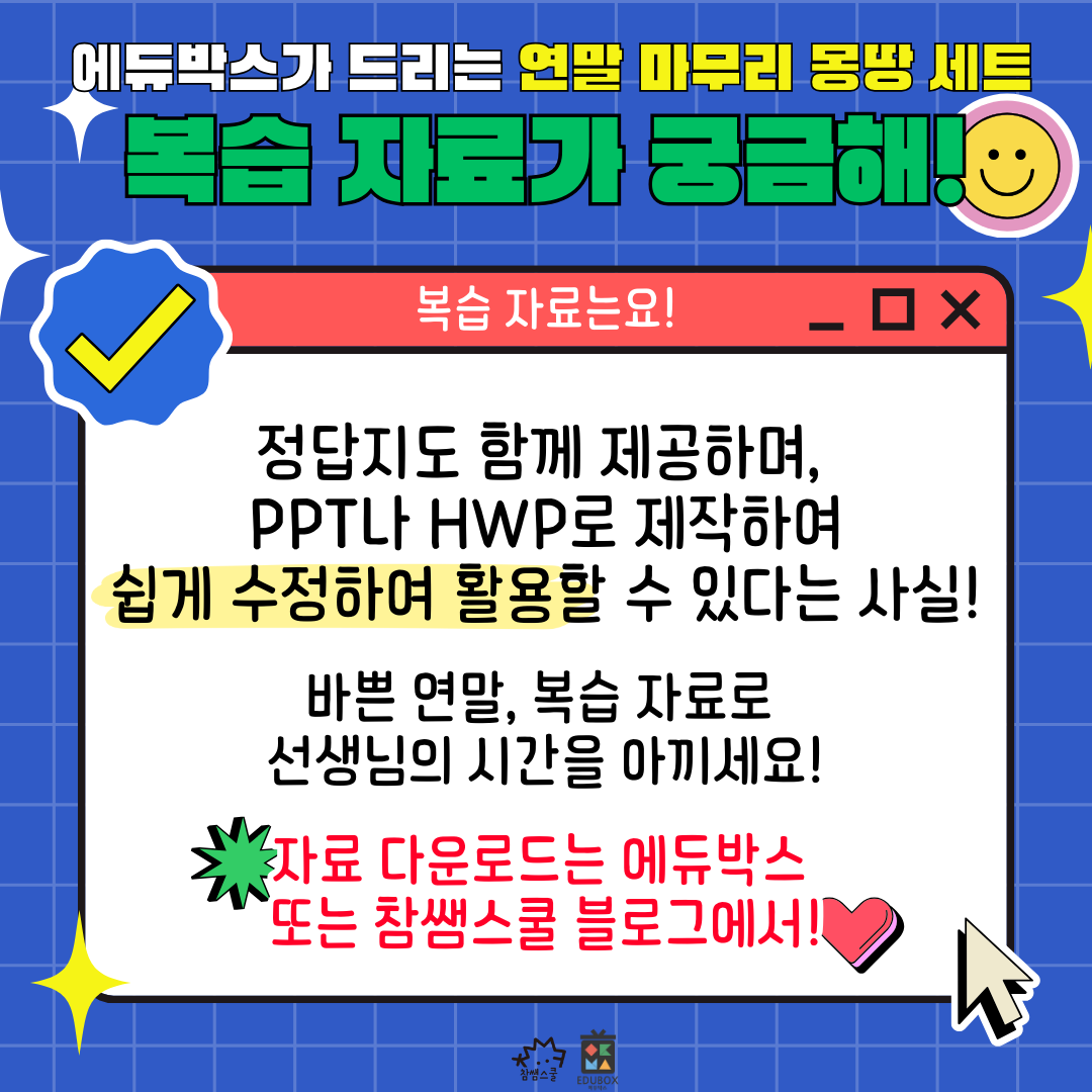 문제도 직접 편집 가능하도록 hwp, ppt로 제작했으니 모두 바쁜 연말 꼭 활용해 보세요!