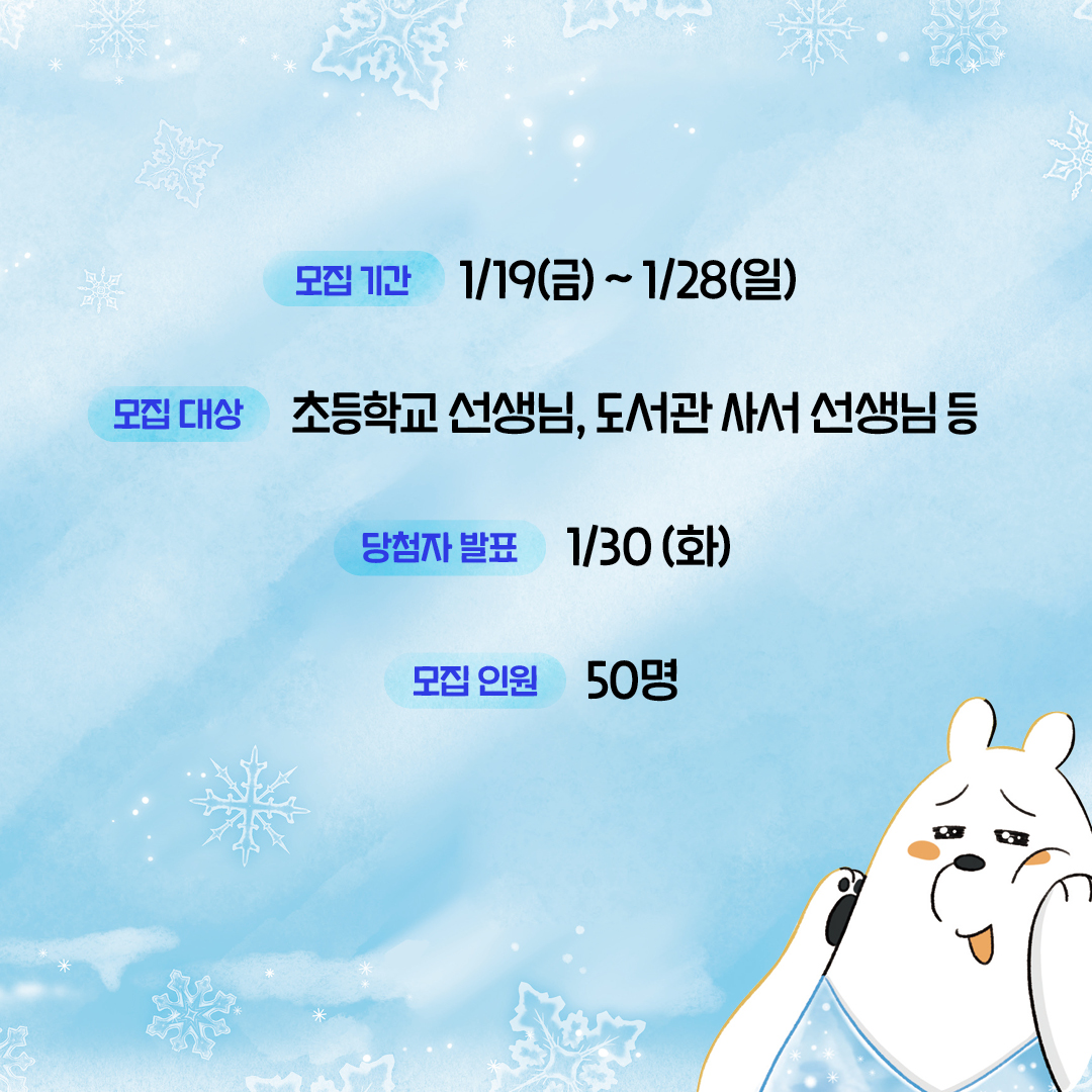 ● 모집 대상 : 초등학교 선생님, 도서관 사서 선생님 등 관련 직종에 근무하고 계신 분