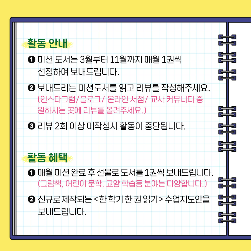 1) 미션 도서는 3월부터 11월까지 매월 1권씩 선정하여 보내드립니다. (그림책, 어린이 문학, 교양학습 도서 중 1권)