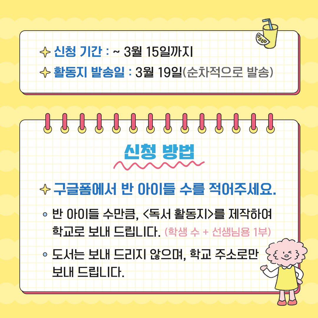 수업을 하는 학급에 수업 시 사용하실 수 있는 '독서 활동지'를 보내드립니다.