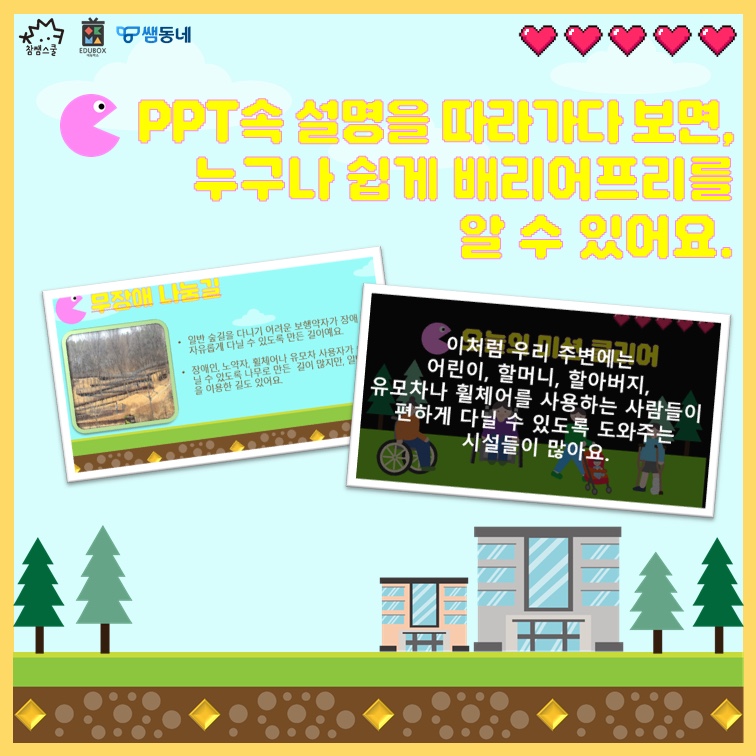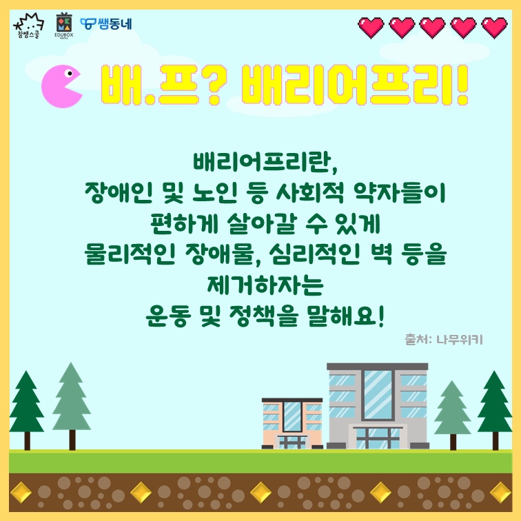 배리어프리란, 장애인 및 노인등 사회적 약자들이 편하게 살아갈 수 있게 물리적인 장애물, 심리적인 벽등을 제거하자는 운동 및 정책을 말해요!