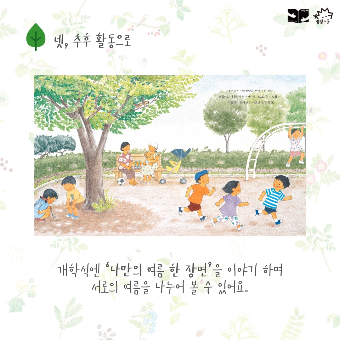 가만히 들여다보면 보이는 한 장면을 찍어 학급소통방에 올려요. 개학한 후에 사진을 소개해요. 그럼 여름방학 이야기 나누기도 뚝딱!🙌