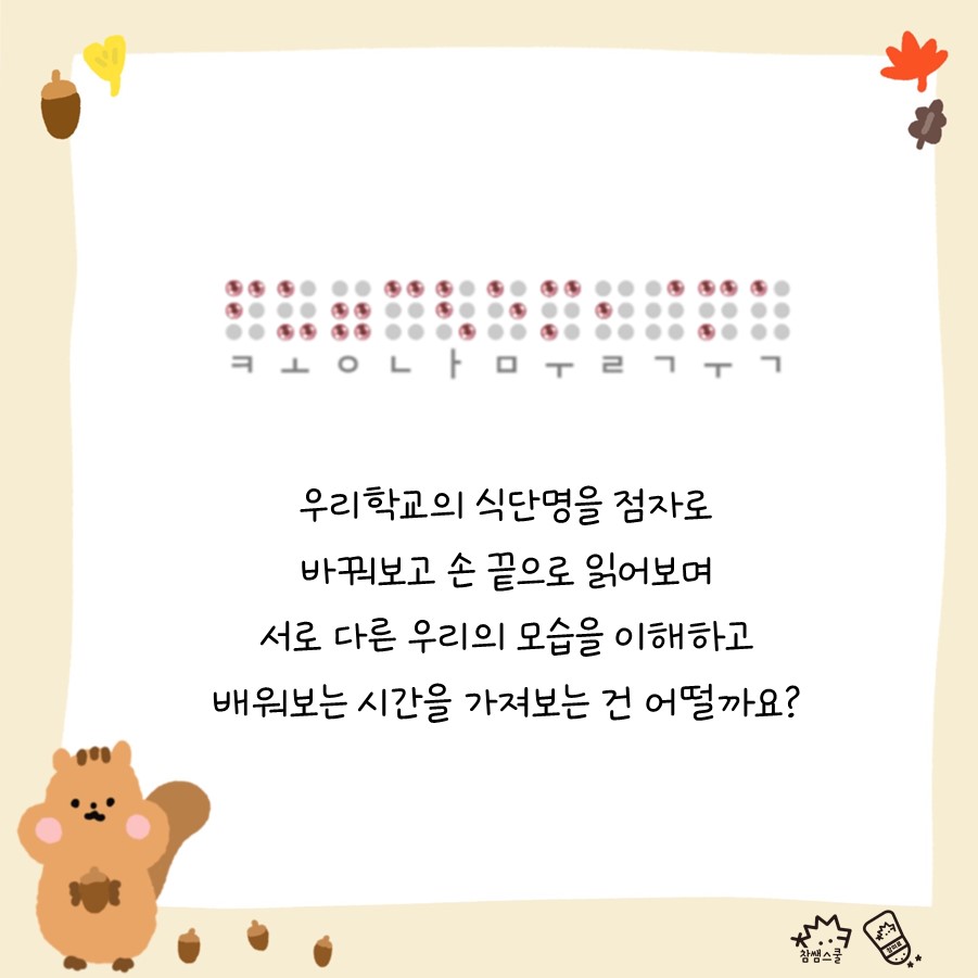 우리학교의 식단명을 점자오 바꿔보고 손 끝으로 읽어보며