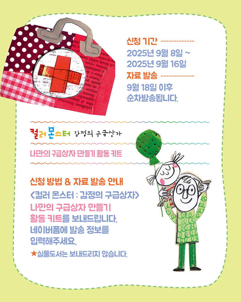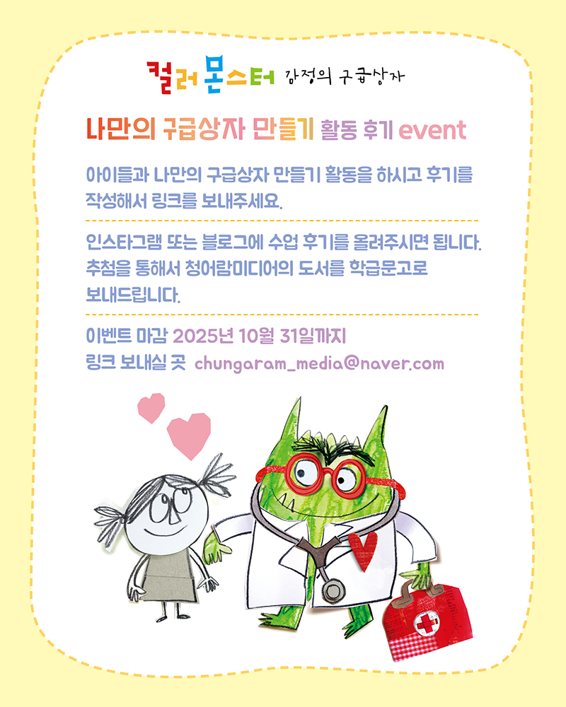 청어람미디어의 <컬러 몬스터 감정의 구급상자>로 수업을 하는 학급에 수업시 사용할 수 있는 '나만의 구급상자 만들기 활동 키트'를 보내드립니다.