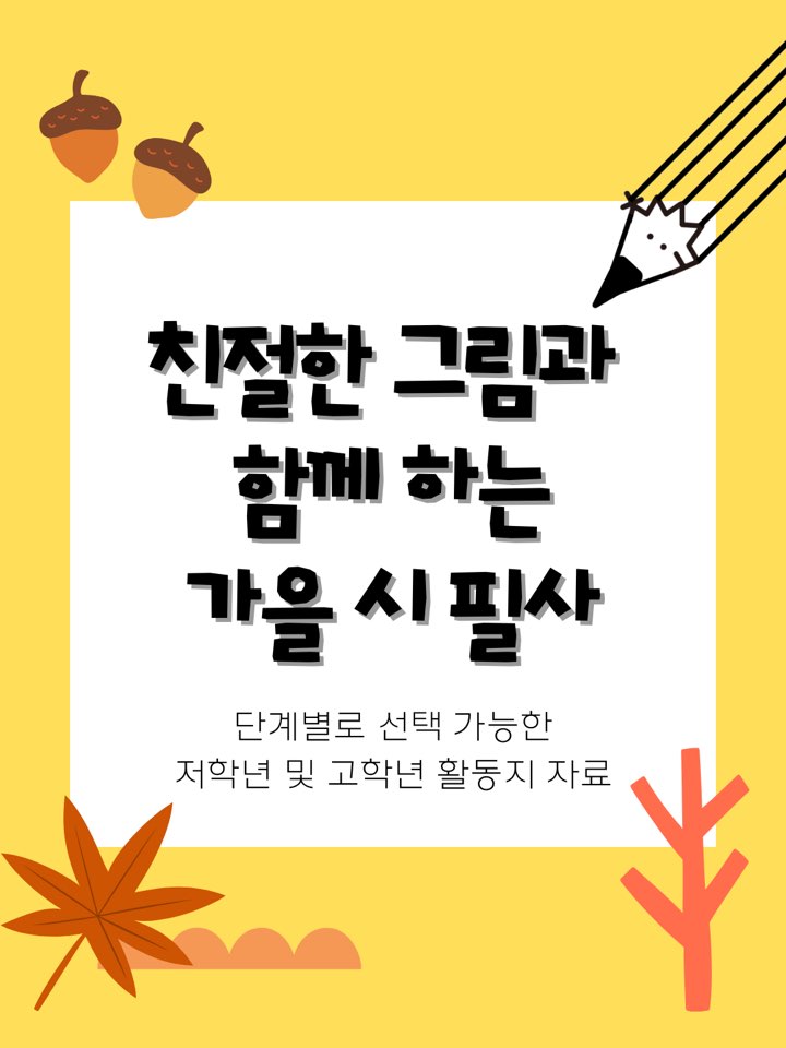 선선한 가을 내음이 물씬 풍기는 필사 자료를 준비했어요. 미술, 국어, 또는 아침 시간에 언제든지 활용할 수 있도록 한 장의 활동지에 모든 것을 담았답니다.
